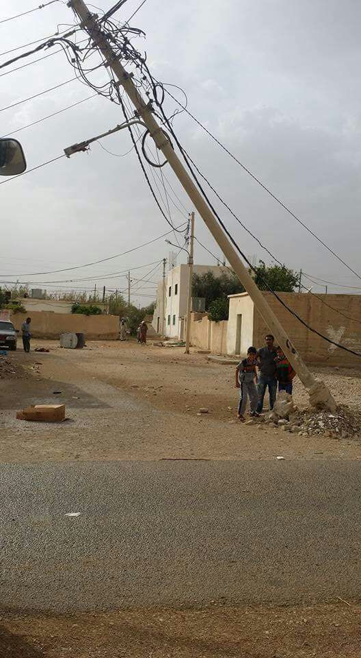 وتشهد في الأثناء مناطق الحسا وجرف الدراويش بالطفيلة الواقعتين على الطريق الصحراوي هبوبا شديدا للرياح تسببت بإثارة الغبار على الطريق، ما قلل من مدى الرؤية الأفقية أمام حركة المرور وسقوط سبعة أعمدة ناقلة للتيار الكهربائي ما أدى إلى انقطاع الكهرباء عن مناطق في الحسا، كما تكسرت أشجار قريبة من منازل مواطنين .