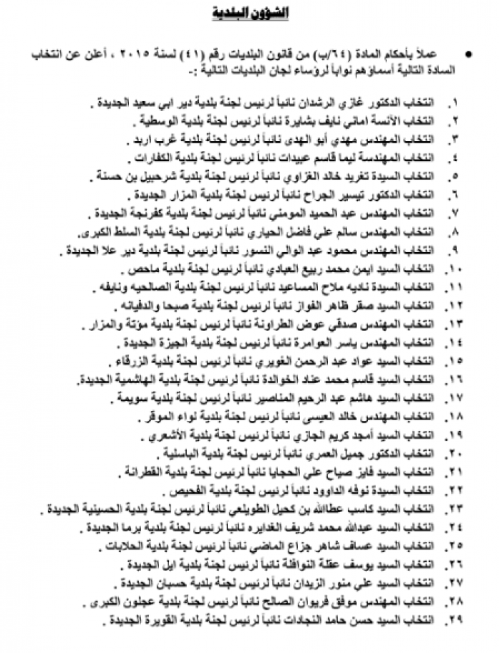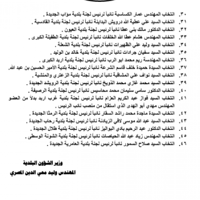 أعلنت وزارة الشؤون البلدية عن انتخاب السادة التالية أسماؤهم نوابا لرؤساء لجان البلديات التالية: