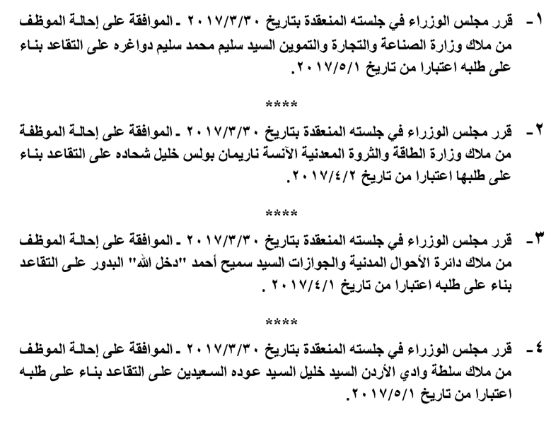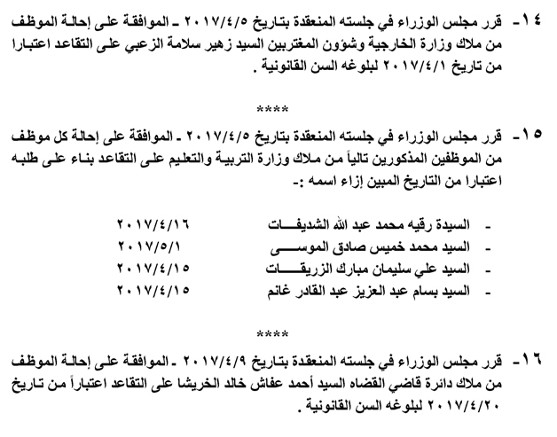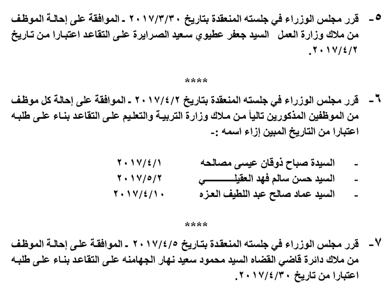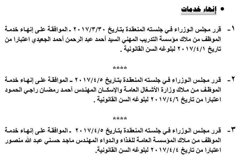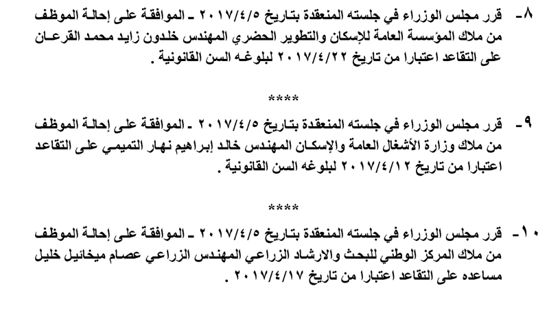 وافق مجلس الوزراء ، في جلسته ليوم الاحد ، على إحالة عدد من الموظفين في عدة وزارات ودوائر حكومية لتقاعد .وجاءت قرارات الاحالة كما يلي :