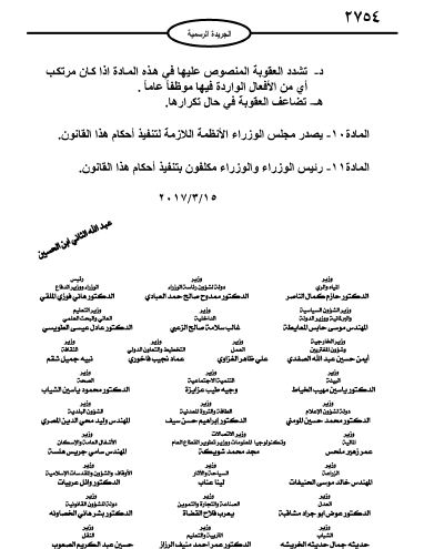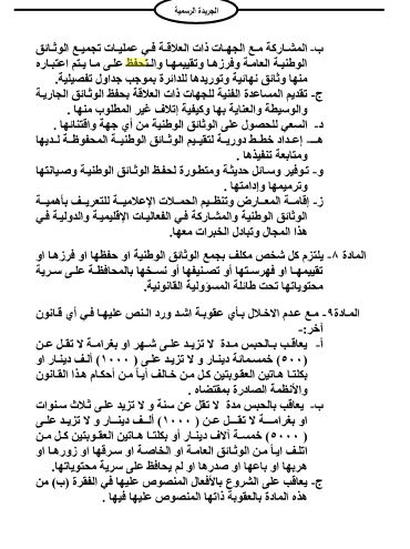 وبحسب القانون الذي نشر بالجريدة القانون الحبس مدة لا تقل عن سنة ولا تزيد على ثلاث سنوات أو بغرامة لا تقل عن 1000 دينار ولا تزيد على 5000 دينار أو بكلتا هاتين العقوبتين كل من أتلف أيا من الوثائق العامة او الخاصة أو سرقها أو زورها أو هربها أو باعها أو صدرها أو لم يحافظ على سرية محتوياتها.