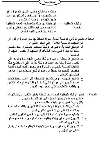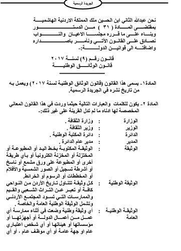 صدرت الإرادة الملكية السامية بالمصادقة على قانون الوثائق الوطنية لسنة 2017 والذي بدأ العمل به من تاريخ نشره الجريدة الرسمية.