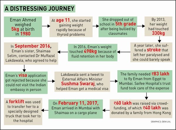 الأطباء وفقا للصحيفة الهندية يريدون أن تقوم إيمان بالجلوس في وضع مستقيم على مقعد وتمرير البول دون مساعدة من القسطرة، مضيفين أن ساقي إيمان قصيرتان جدا ولم تتطورا على الإطلاق تحت ركبتيها، وقالوا إنها سوف تحتاج إلى العلاج الطبيعي المكثف لتكون قادرة على المشي مرة أخرى.