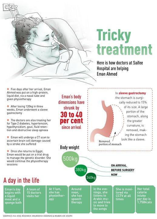إيمان وعقب إجرائها جراحة تكميم المعدة واتباعها نظام غذائي صارم تبدأ يومها في السادسة صباحا بتناول وجبة سائلة عالية البروتين يليها حمام إسفنج، وبعدها تدخل سلسلة من اختبارات الدم الروتينية والفحوص، حيث يقوم فريق مكون من 15 طبيبا، بينهم طبيب الغدد الصماء، وأمراض الكلى، وأخصائي الأعصاب، وأخصائي التخدير، وأخصائي الأمراض الرئوية والتغذية، بزيارتها كل صباح، وفي الحادية عشرة صباحا تقوم بجلسات العلاج الطبيعي، والتي تشمل التدليك والممارسة الرياضية الخفيفة.