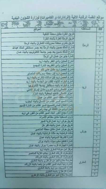 تحتوي القائمة المرفقة تاليا على مواقع وجود انظمة الرقابة الآلية (الرادارات والكاميرات المخصصة لمراقبة سرعة المركبات) التابعة لوزارة الشؤون البلدية في مناطق الشمال ، وهي اربد والمفرق وعجلون والرمثا وجرش