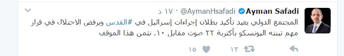 اعتبر وزير الخارجية وشؤون المغتربين أيمن الصفدي تصويت منظمة الأمم المتحدة للتربية والعلم والثقافة (اليونسكو)، الثلاثاء، على قرار فلسطيني بالموافقة على قرار ينص على اعتبار القدس مدينة محتلة تأكيدأ من المجتمع الدولي على بطلان اجراءات الاحتلال في القدس، ويعتبر القدس مدينة محتلة، وذلك في تغريدة له على تويتر.