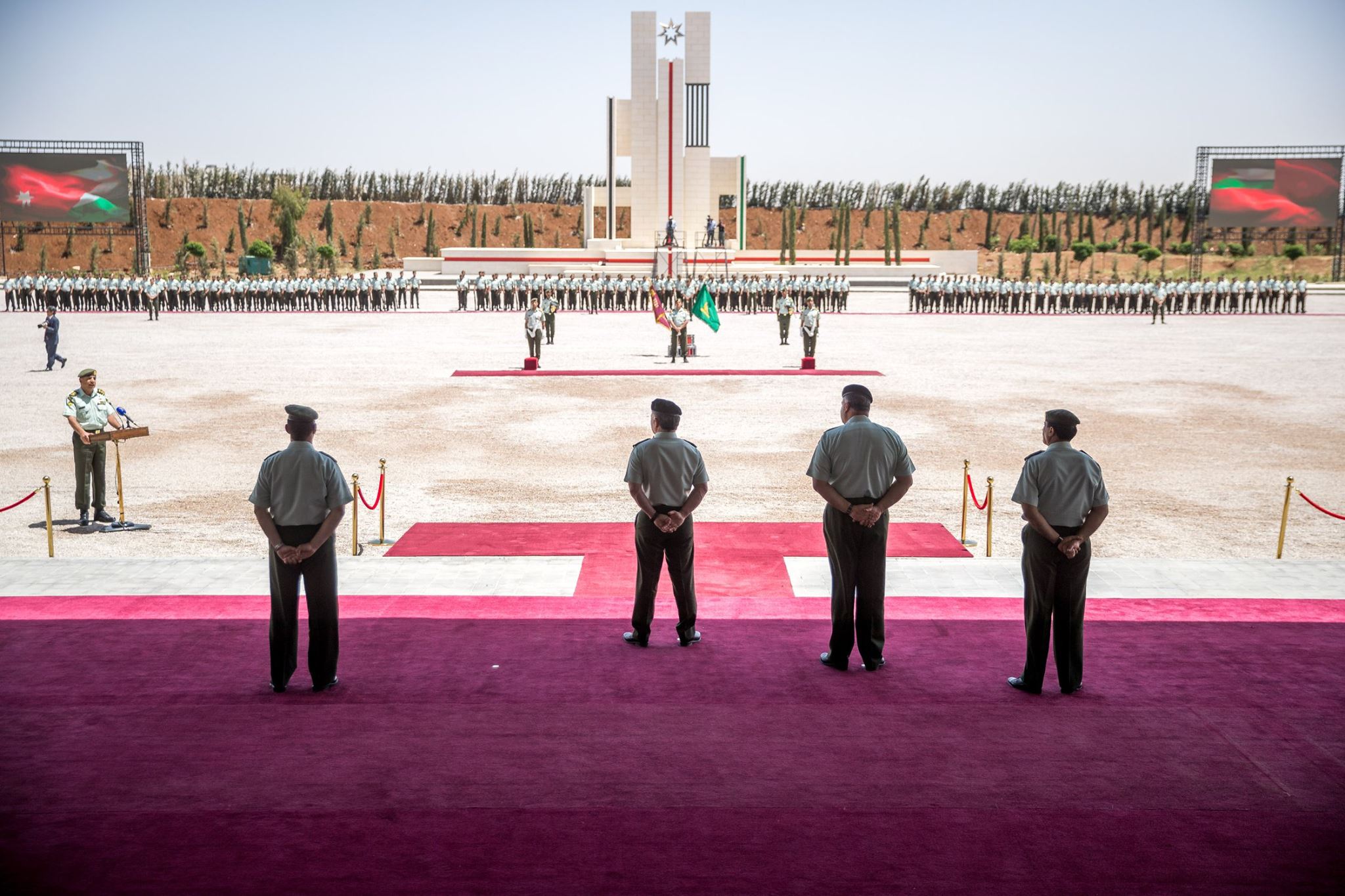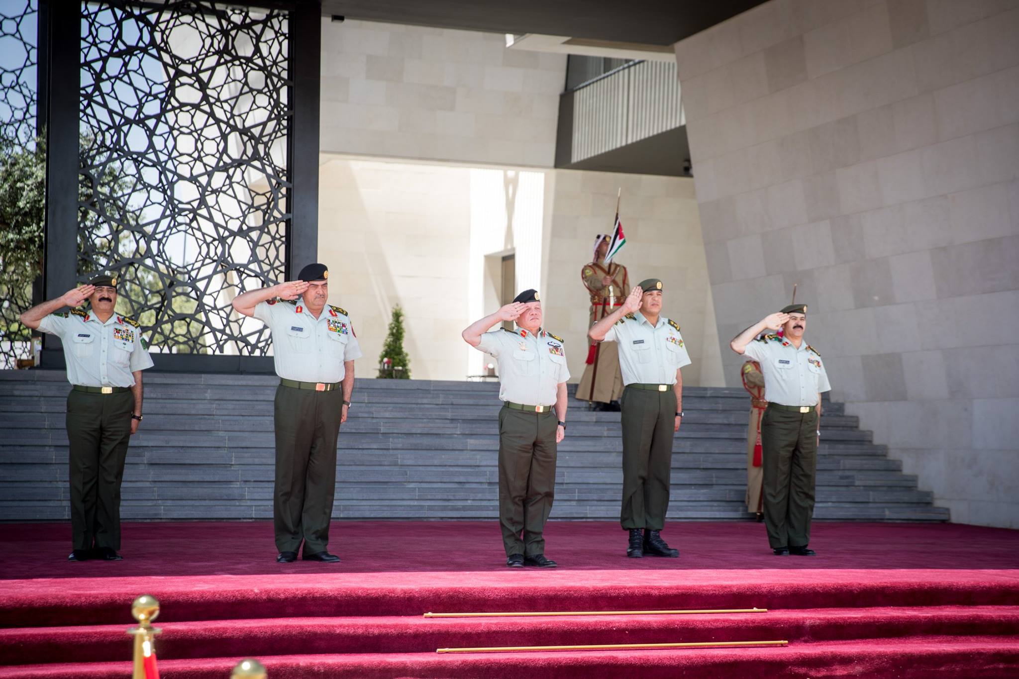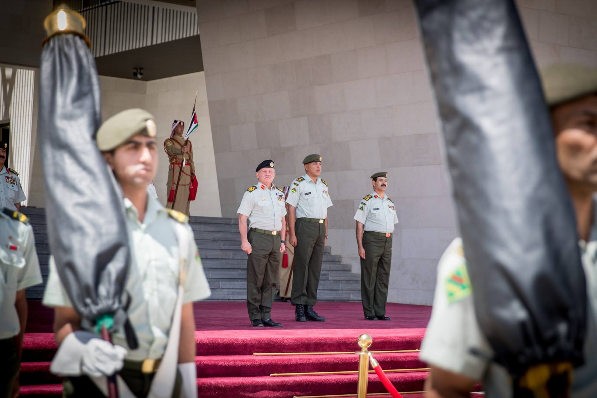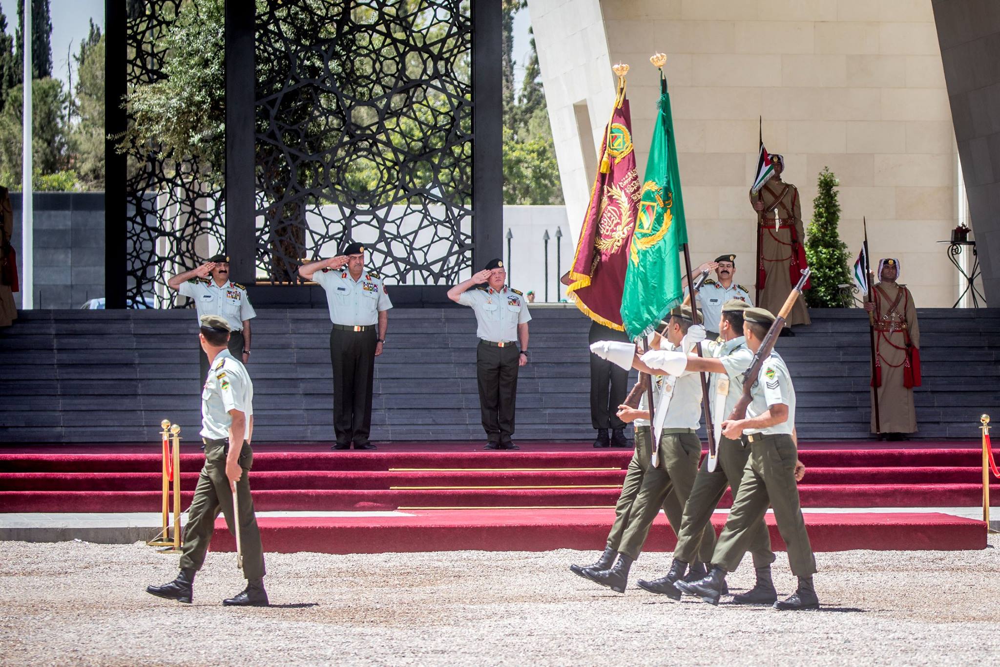 ولدى وصول جلالته موقع الاحتفال، كان في استقباله رئيس هيئة الأركان المشتركة، وعدد من كبار ضباط القوات المسلحة، فيما أطلقت المدفعية إحدى وعشرين طلقة تحية لجلالته.