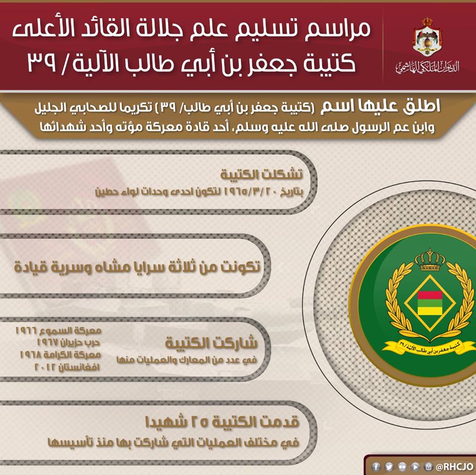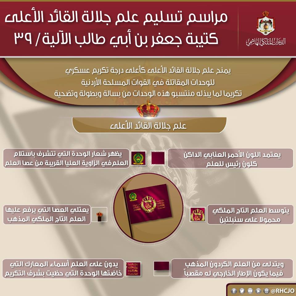 سلّم جلالة الملك عبدالله الثاني، القائد الأعلى للقوات المسلحة، اليوم الاثنين، علم جلالة القائد الأعلى إلى كتيبة جعفر بن أبي طالب الآلية/39، من لواء الأميرة عالية الآلي/48، والتي يعود تأسيسها إلى عام 1965.
