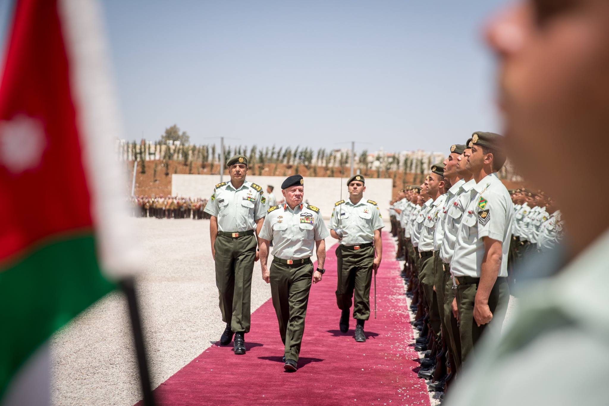 وتلا ذلك دخول علم جلالة القائد الأعلى وعلم كتيبة جعفر بن أبي طالب، حيث اصطف حاملو الأعلام، استعداداً لاستلام علم جلالة القائد الأعلى، فيما تفقد جلالة القائد الأعلى طابور الاستعراض.