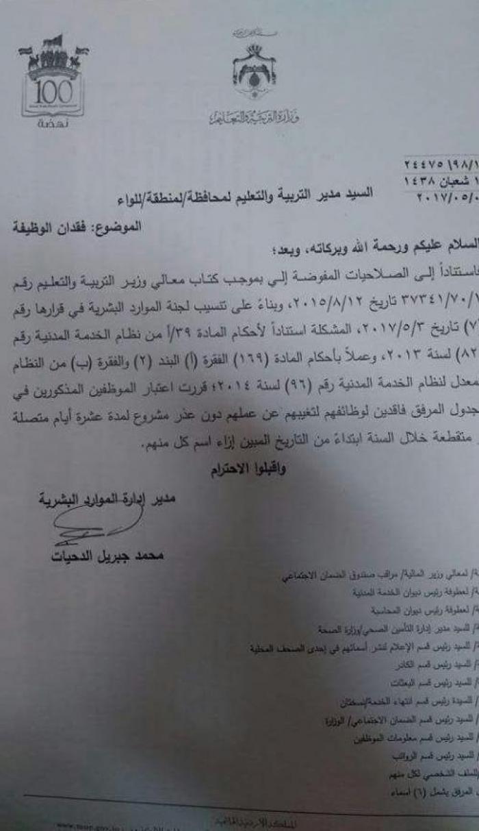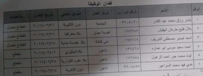 قررت وزارة التربية والتعليم وبناء على تنسيب لجنة الموارد البشرية اعتبار (٦) موظفين فاقدين لوظائفهم لتغيبهم عن عملهم دون عذر مشروع لمدة عشرة ايام متصلة او متقطعة خلال السنة.وتاليا الاسماء: