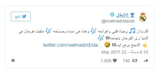 وعبر حسابه الرسمي الناطق باللغة العربية، على موقع تويتر، غرَّد النادي الملكي محتفِلاً بالتتويج وبمدربه زين الدين زيدان، قائلاً: "زيدان وحياة قلبي وأفراحه وهناه في مساه وصباحه ما لقيت (لم أجد) فرحان في الدنيا زي (مثل) الفرحان بنجاحه! الناجح يرفع إيده (يده)".