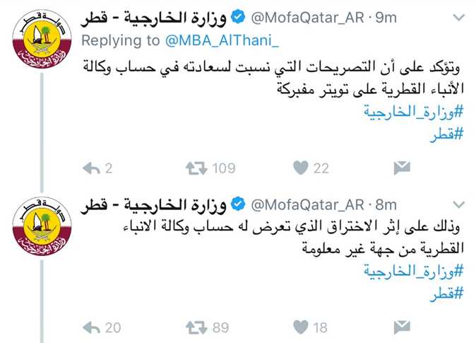 وأفاد حساب الوزارة الرسمي عبر موقع التدوينات القصيرة «تويتر»، بأنها «تنفي صدور أي تصريحات للشيخ محمد بن عبدالرحمن آل ثاني وزير الخارجية، وتؤكد على أن التصريحات التي نسبت له في حساب وكالة الأنباء القطرية على تويتر مفبركة، وذلك على إثر الاختراق الذي تعرض له حساب وكالة الأنباء القطرية من جهة غير معلومة».
