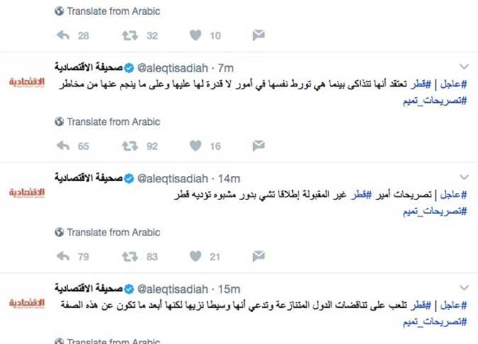 بينما قالت صحيفة الاقتصادية السعودية عبر «تويتر»: «مواقف قطر معروفة ضد مصالح الدول الخليجية والعربية تؤكد أنها تبحث عن دور أكبر مهما كان الثمن»، وتابعت: «قطر تعتقد أنها تتذاكى بينما هي تورط نفسها في أمور لا قدرة لها عليها وعلى ما ينجم عنها من مخاطر»، وأضافت: «تصريحات أمير قطر غير المقبولة إطلاقا تشي بدور مشبوه تؤديه قطر».