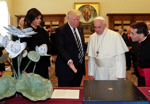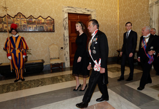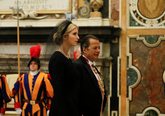 حضر الرئيس الأميركي، برفقة زوجته ميلانيا وابنته إيفانكا وصهره غاريد كوشنر، إلى روما للقاء البابا فرنسيس، الأربعاء .وقد ظهرت السيدة الأولى الأميركية ميلانيا ترامب وابنة الرئيس إيفانكا ترامب وهما يرتديان وشاحاً أسود على الرأس.ويعتبر هذا بروتوكولاً معتمداً في الفاتيكان، كشرط للقاء النساء لبابا الفاتيكان.