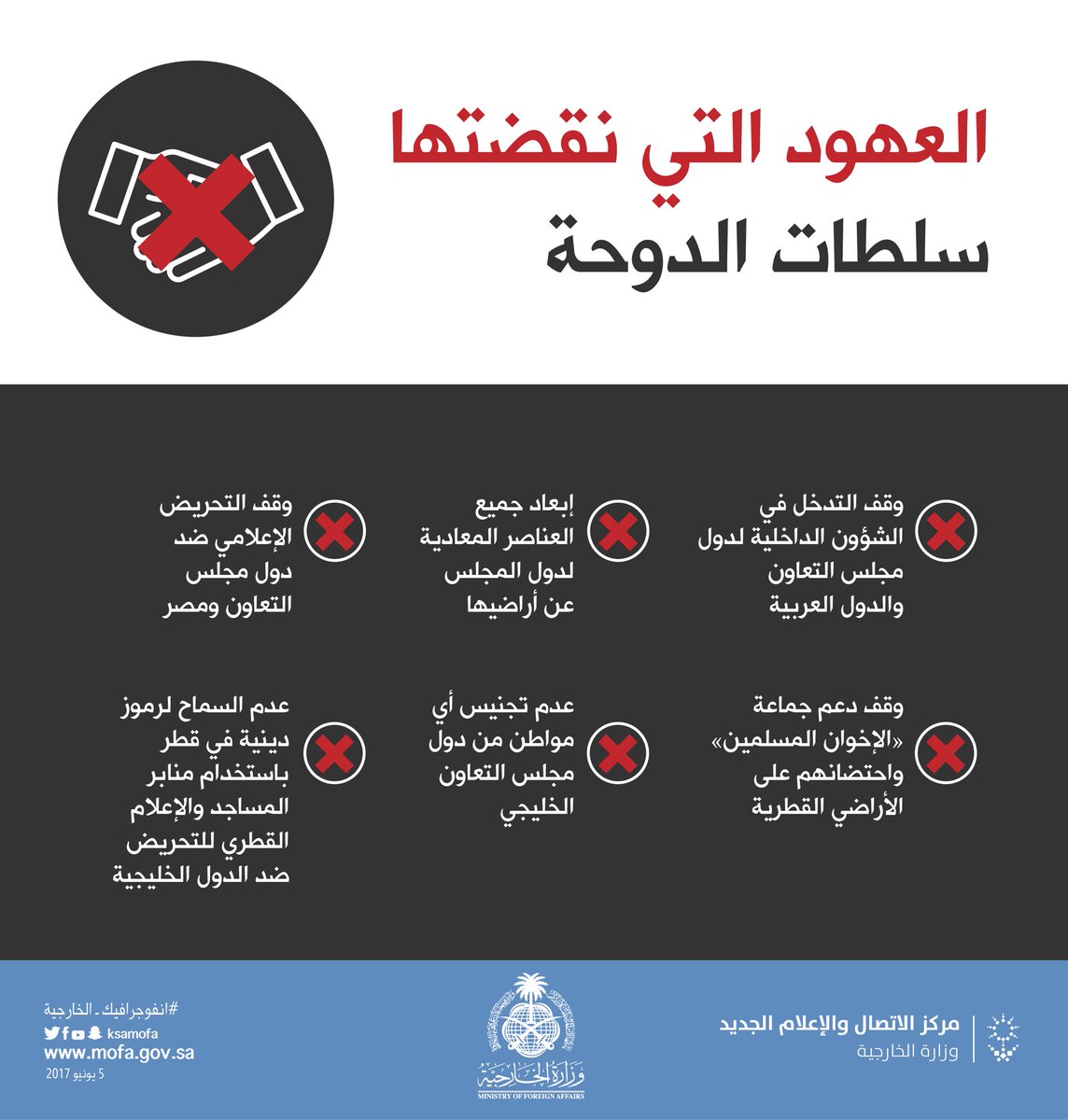 عددت وزارة الخارجية في المملكة العربية السعودية، الثلاثاء، العهود التي قالت إن سلطات الدوحة نقضتها، ذاكرة أنه "بعد صبر طويل" جاء قطع العلاقات الدبلوماسية والقنصلية معها.
