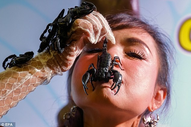 غطّت امرأة جسدها بالعقارب بمدينة باتايا التايلاندية لتلقب بملكة العقارب.