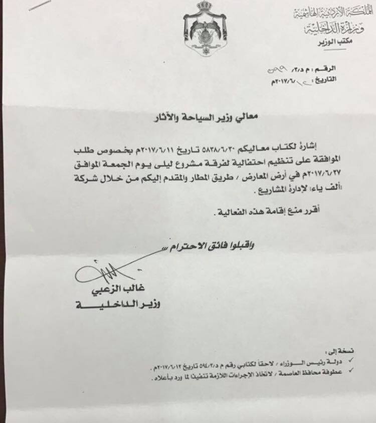 قرر وزير الداخلية غالب الزعبي منع اقامة حفل فرقة مشروع ليلى في عمان.وبين الزعبي ان هذا القرار جاء نظرا لما يقام في هذا الحفل من فقرات استفزاز للمشاعر العامة بالاضافة الى ردات الفعل الغاضبة من المواطنين عليه.
