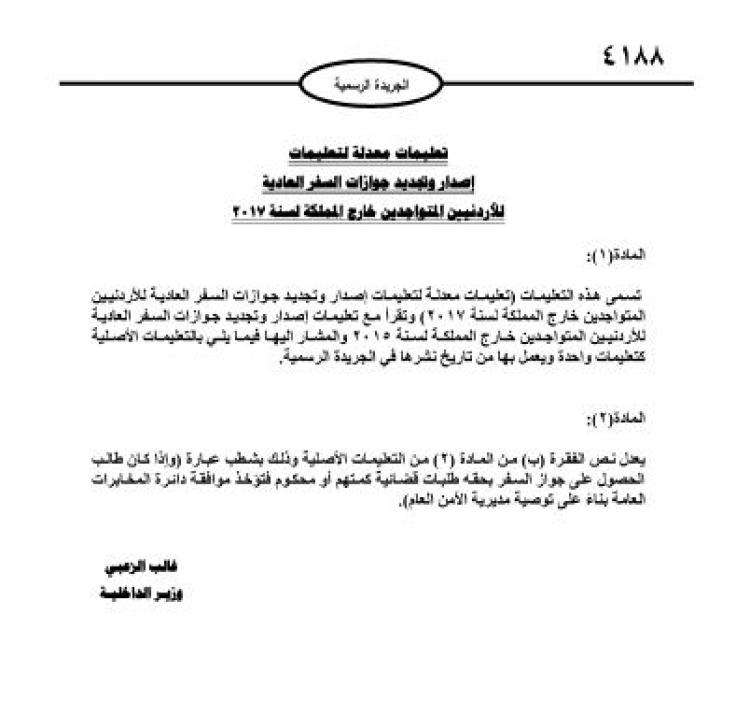 وحسب تعديل على التعليمات الخاصة بإصدار الجوازات العادية، للأردنيين خارج المملكة، يُلغى شرط موافقة المخابرات، لإصدار جواز سفر للشخص الذي بحقه طلب قضائي، كمتهم أو محكوم.