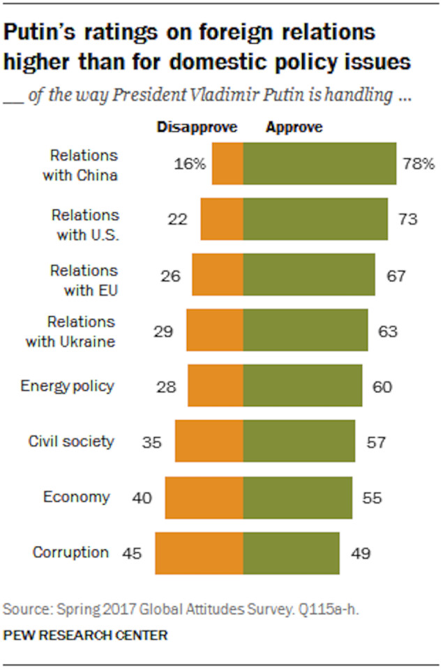 وبيّنت أرقام الإستطلاع أنّ الروس يستمرّون بإعطاء علامات عالية لبوتين بسبب أجندة سياساته الخارجيّة، فقد وجد معظمهم أنّ الرئيس يمسك جيدًا بمفاتيح السياسة الخارجية ولكنّ تقديراتهم للإقتصاد الروسي لم تكن بمستوى جيّد.