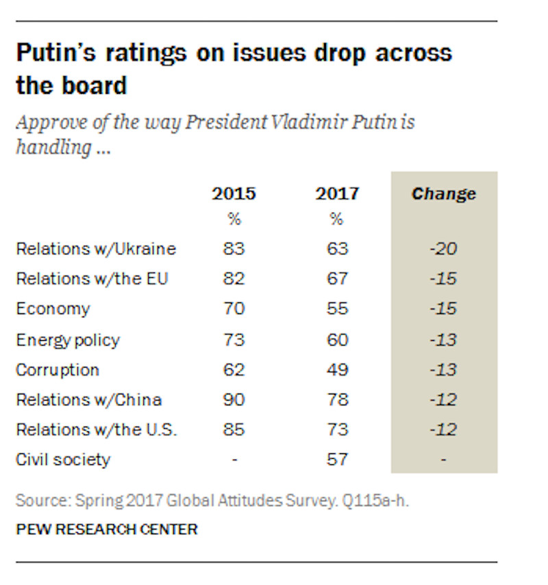 وفي تقييم لبوتين وإذا ما كان سيتمكّن من العودة الى قصر الرئاسة العام المقبل أو سيتم إبعاده عن الساحة، أجرى مركز "بيو" للأبحاث الأميركي إستطلاعًا للرأي شاركت فيه عيّنة من 1200 روسي، أجابوا عن أسئلة من منتصف شباط حتى نيسان 2017.
