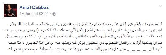 وعرضت الدباس عبر صفحتها على فيسبوك بعض الجمل التي تبنتها القناة في مسلسلاتها مع اعتذارها "يلعن اللي نفضك، واكلنا كندره".