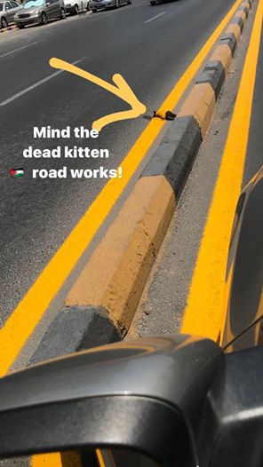 انتشر على مواقع التواصل الاجتماعي صورة تظهر قط يبدو أنه تعرض لحادث دهس قرب احد الأرصفة في أحد مناطق العاصمة عمان، وحمل لون خط الشارع الأصفر بعد قيام عمال الأمانة بدهان الشارع.