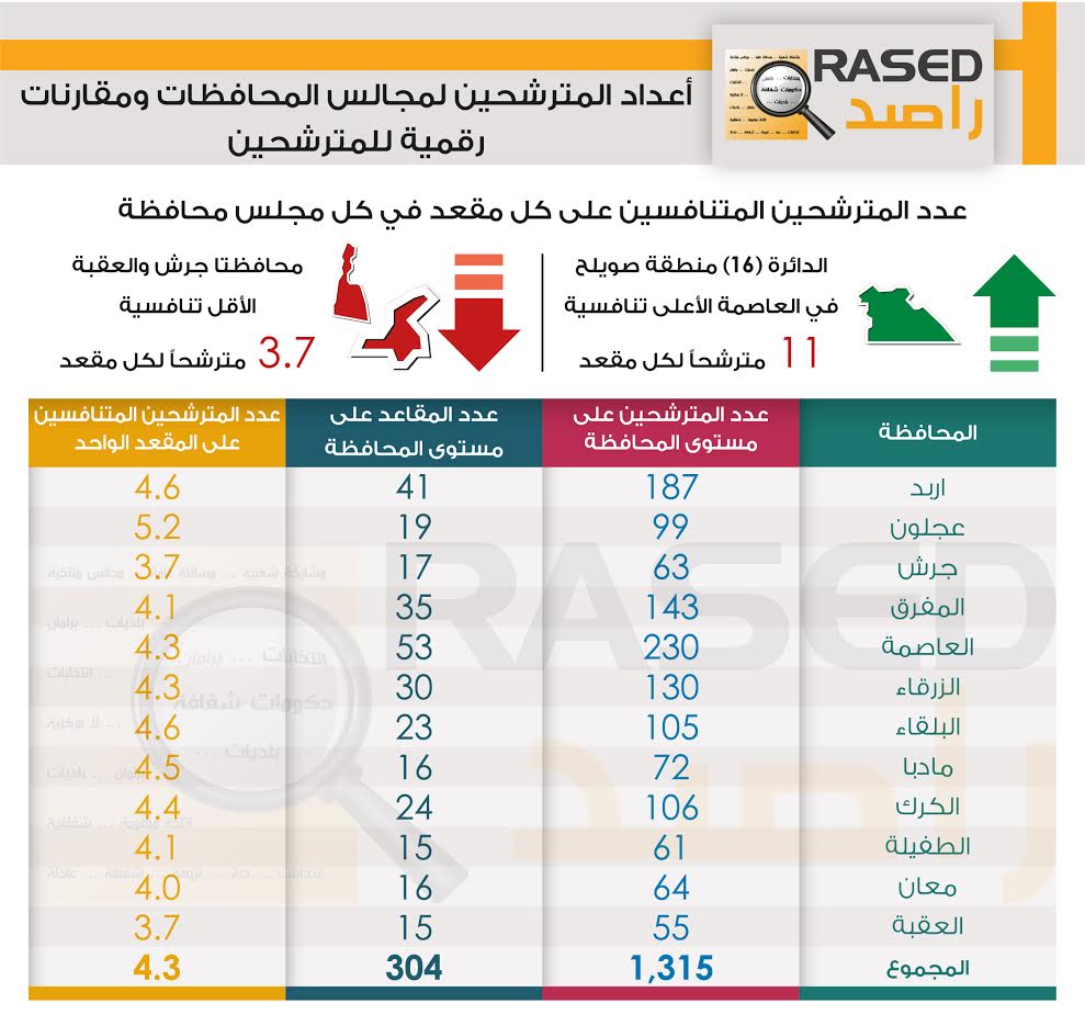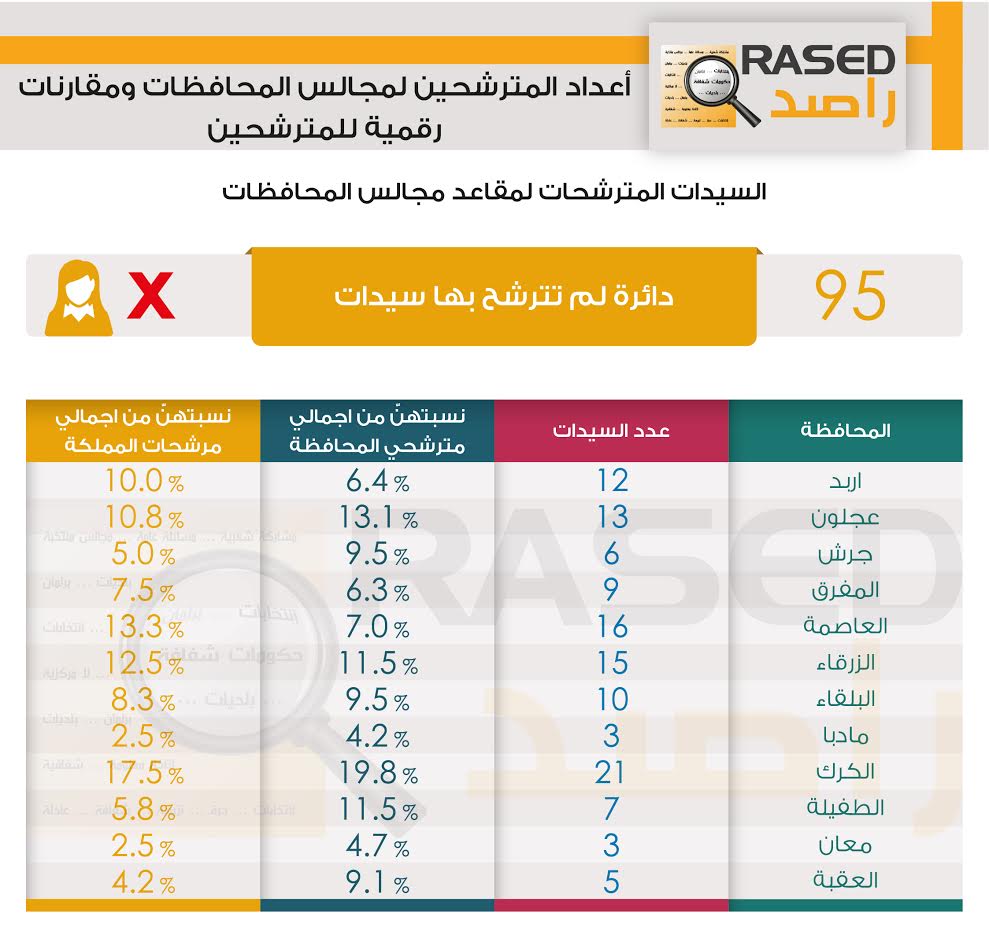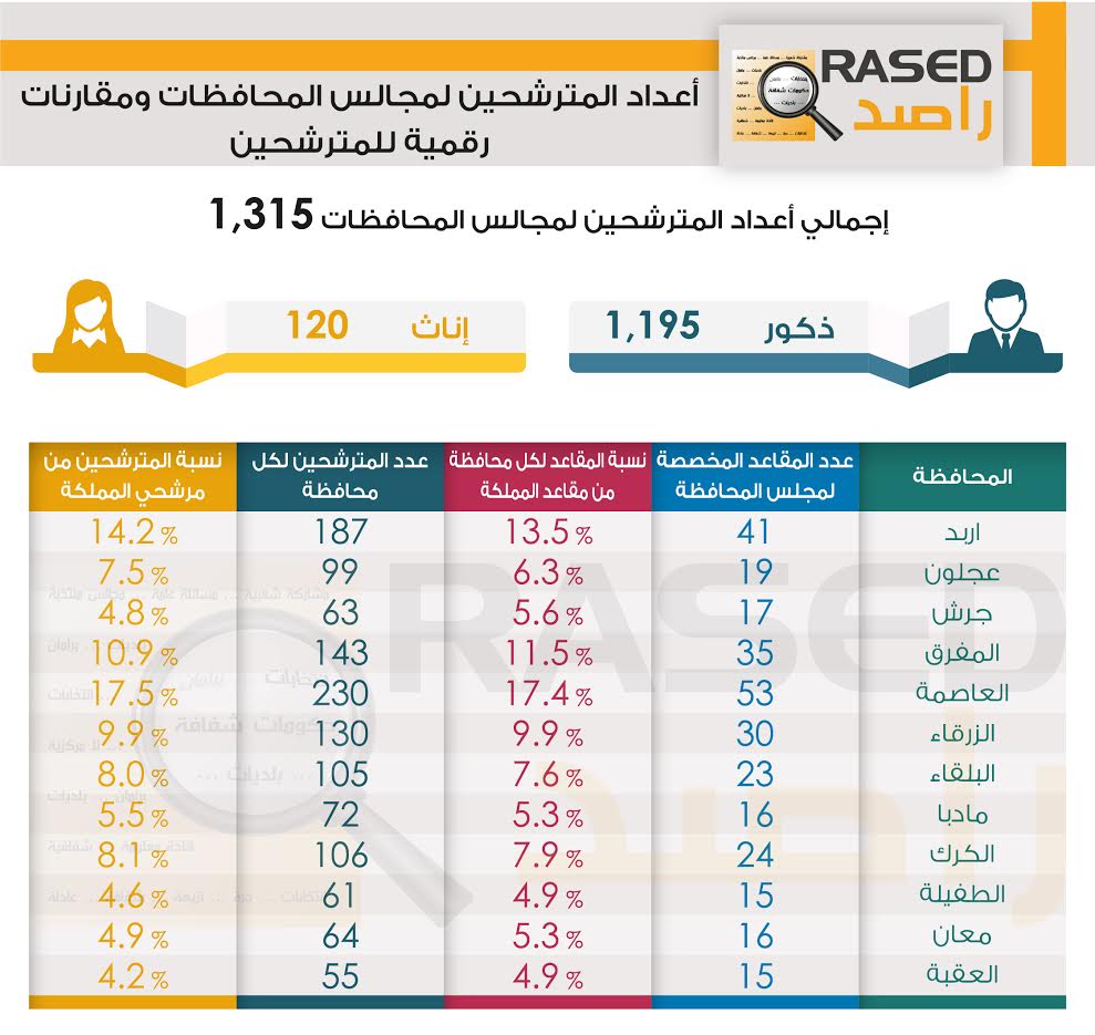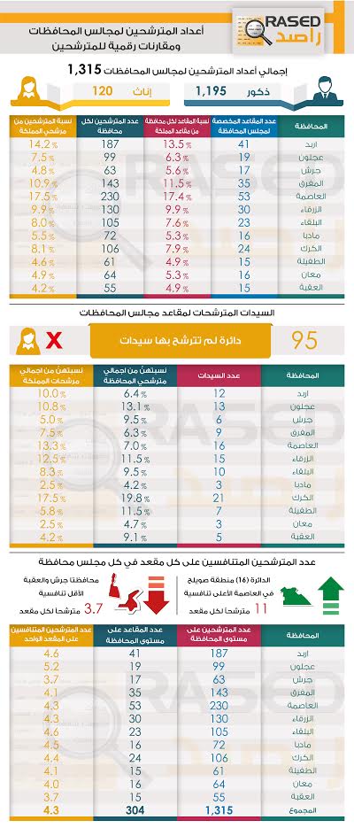 وتشير مخرجات تحليل المعلومات الواردة من البيانات التي جمعها فريق راصد بعد إنتهاء عملية تسجيل المترشحين لانتخابات المجالس البلدية ومجالس المحافظة بتاريخ 5/7/2017 أن عدد المسجلين لإنتخابات مجالس اللامركزية (المحافظات) بلغ (1315) مترشحاً ومترشحة منهم (120) سيدة وموزعين على 158 دائرة إنتخابية على مستوى المملكة.