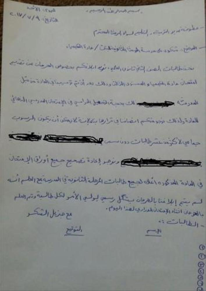 وطالب الاهالي باعادة تصحيح اوراق امتحان الطالبات المدرسية وانصافهن.