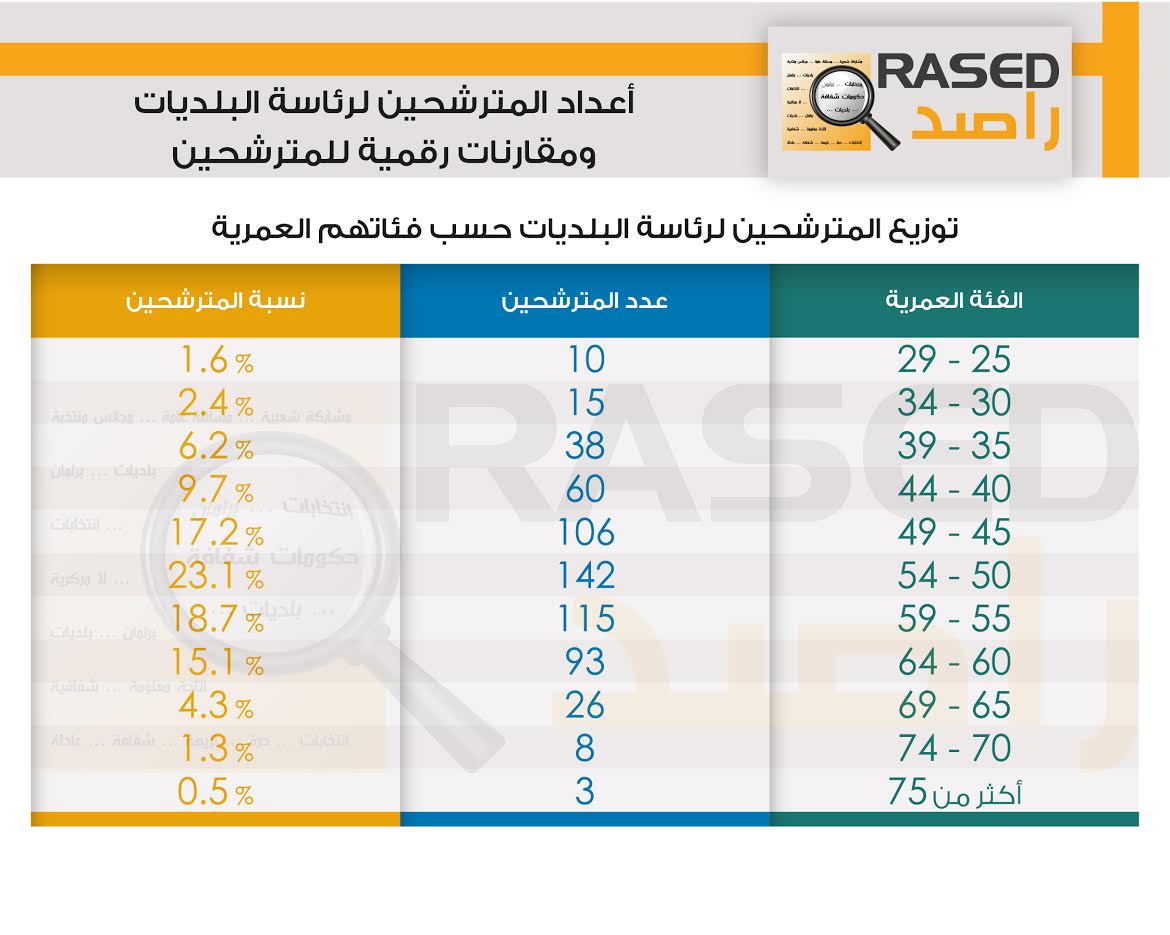 كما بينت المعلومات أن أعداد المترشحين لموقع رئيس البلدية والتي تتراوح أعمارهم بين 25 – 29 سنة قد بلغ مجموعهم 10 مرشحين، وبلغ مجموع المترشحين الذين تراوحت أعمارهم بين 50 – 54 سنة 142 مترشح، وبينت المعلومات التي عمل فريق راصد على جمعها وتحليلها أن 41.3% من المترشحين لموقع رئيس البلدية قد تراوحت أعمارهم بين 50 – 59 سنة، وقد سبق لفريق راصد أن أجرى تحليلاً يختص بالفئات العمرية لمرشحي الانتخابات النيابية لعام 2016 وأظهرت النتائج آنذاك أن أكبر فئة عمرية مترشحة كانت أعمارهم تتراوح بين 50 -59 وبنسبة وصلت إلى 41%.