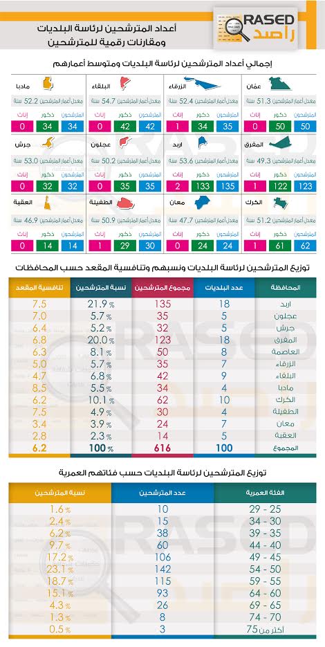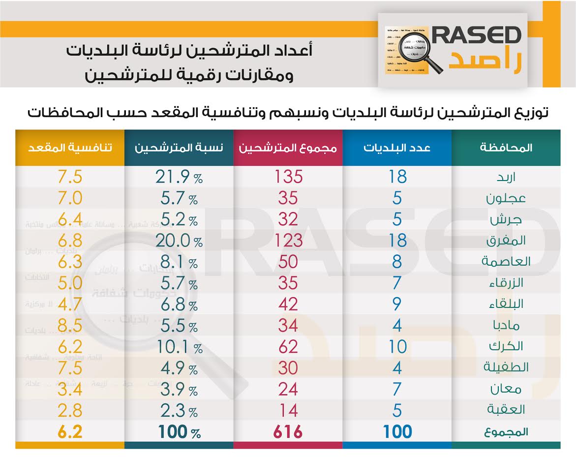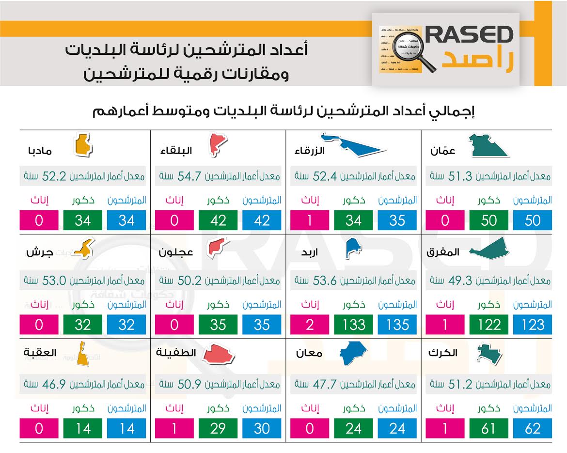 إيماناً بضرورة توفير جميع المعلومات التي يحتاجها المواطن الأردني عن العملية الإنتخابية، نفّذ فريق راصد لمراقبة الانتخابات مجموعه من المقارنات المتخصصة للمترشحين لموقع رئيس البلدية في جميع بلديات المملكة، حيث بينت المعلومات التي جمعها فريق راصد خلال عملية تسجيل المترشحين أن عدد من تقدموا بطلبات للترشح على موقع رئيس البلدية وصل إلى 616 مترشحا ومترشحة في جميع بلديات المملكة منهم 6 سيدات وبنسبة وصلت إلى 1% من مجموع المترشحين.