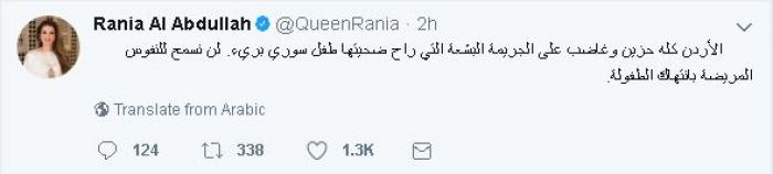 قالت جلالة الملكة رانيا العبدالله إن "الأردن كله حزين وغاضب على الجريمة البشعة التي راح ضحيتها طفل سوري بريء"، في مخيم الحسين وسط العاصمة الجمعة الماضية.