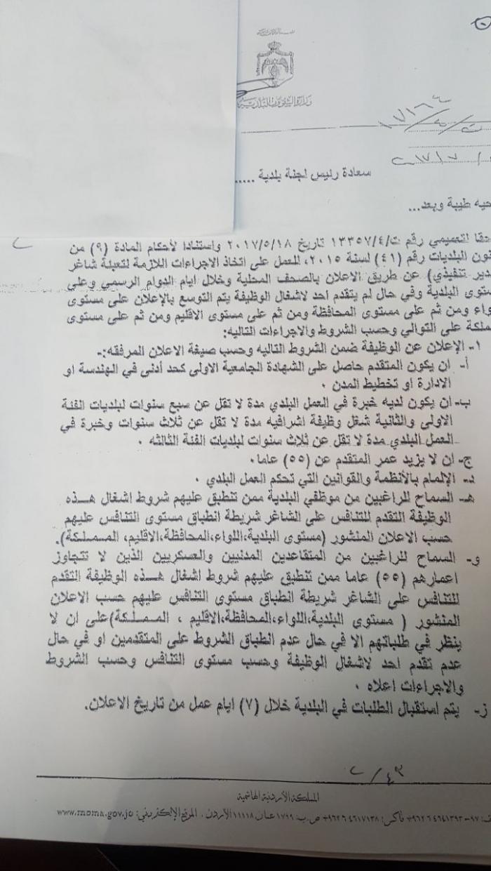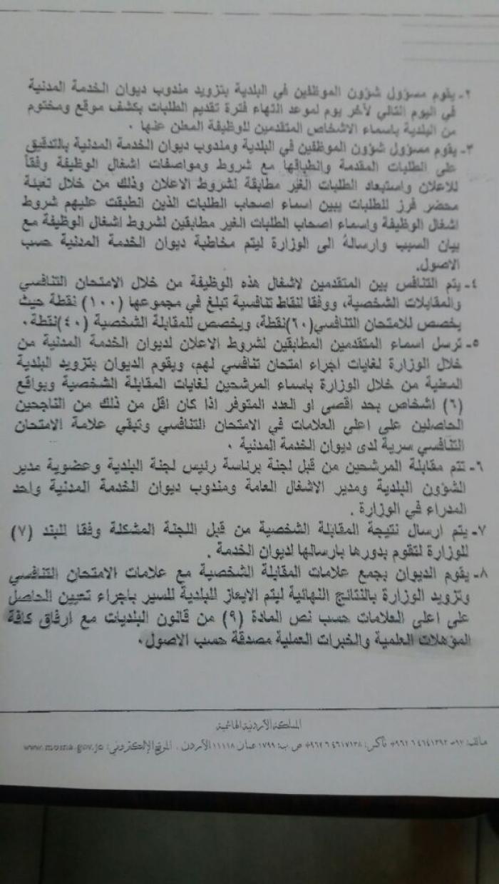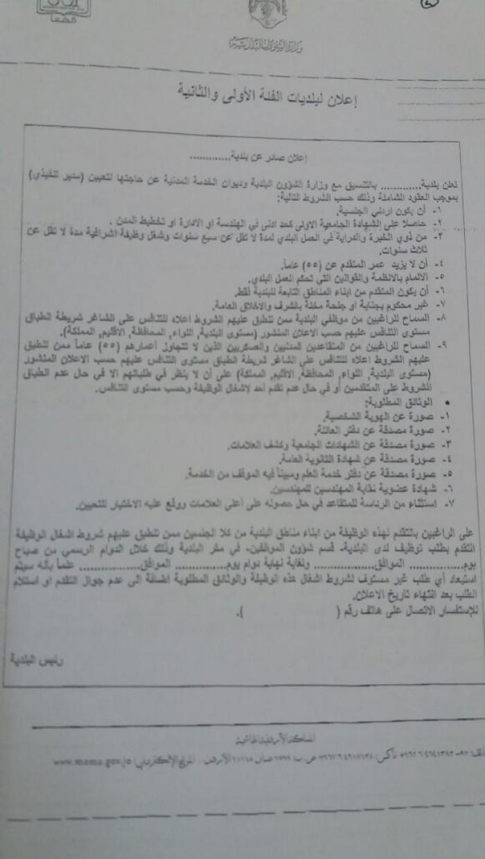 وعممت الوزارة كتابا الى رؤساء لجان البلديات حددت فية الشروط والوثائق المطلوبة حيث تم السماح للراغبين من المتقاعدين المدنيين والعسكريين الذين لاتتجاوز اعمارهم ( ٥٥ ) عاما ممن تنطبق عليهم شروط اشغال الوظيفة التقدم للتنافس على الشاغر شريطة انطباق مستوى التنافس عليهم حسب الاعلان المنشور ( مستوى البلدية ، اللواء ، المحافظة ، الاقليم ، المملكة ) .