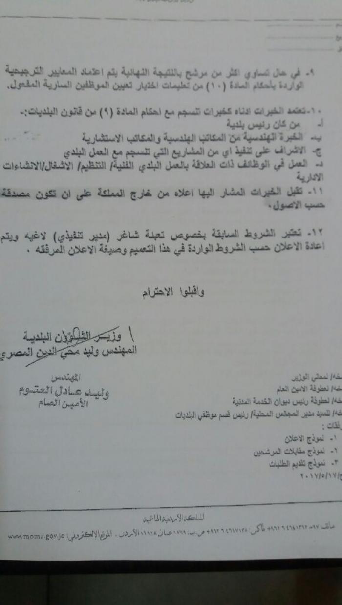 طلب وزير الشؤون البلدية المهندس وليد المصري من رؤساء لجان البلديات بالاعلان بالصحف المحلية لتعبئة شاغر مدير تنفيذي بموجب عقد شامل في بلديات المملكة.