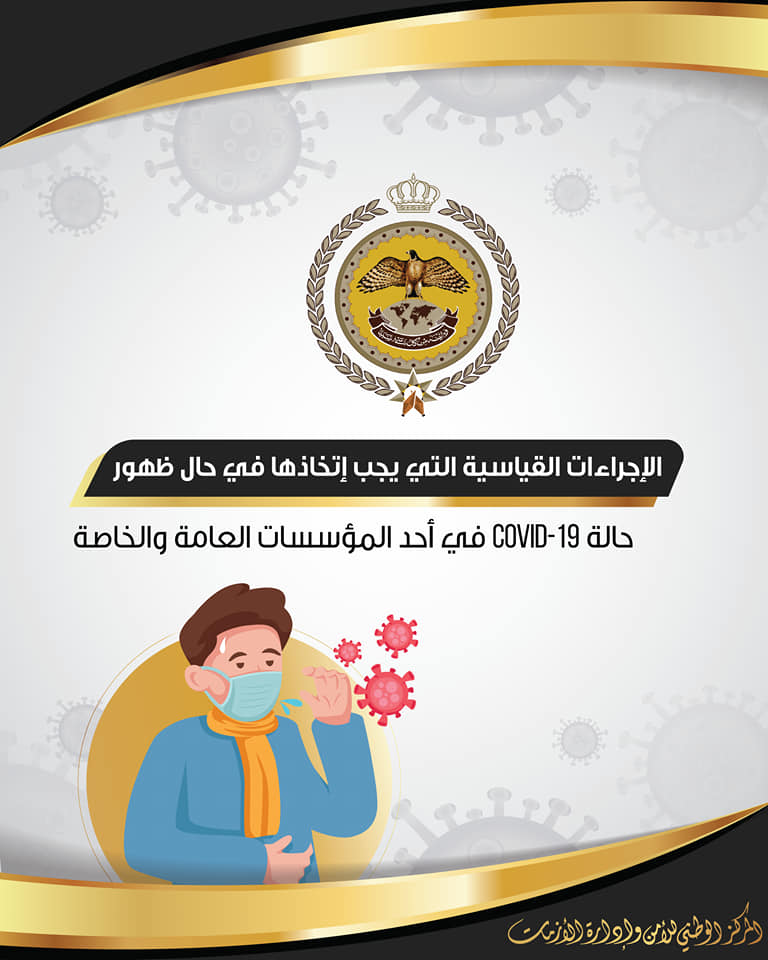 نشر المركز الوطني للأمن وإدارة الأزمات ، دليلا للإجراءات الواجب اتخاذها في حال ظهور حالة كورونا في المؤسسات العامة والخاصة. |