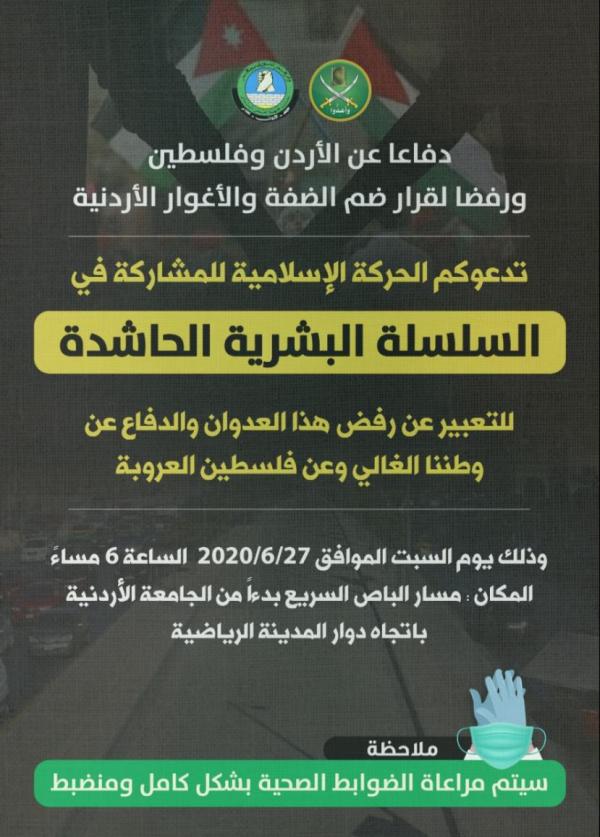 دعت الحركة الإسلامية في الأردن للمشاركة في فعالية سلسلة بشرية، اليوم السبت، رفضًا لقرار الاحتلال الاسرائيلي ضم غور الأردن.وستقام الفعالية في تمام الساعة السادسة مساء في... |