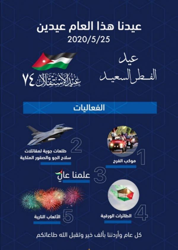 علقت الحكومة، الاحد، على تصادف مناسبتين عيد الفطر وعيد الاستقلال، قائلةعيدنا هذا العيد عيدين؛ عيد الفطر السعيد وعيد استقلال مملكتنا الحبيبة.وتتضمن فعاليات الاحتفال إطلاق... |