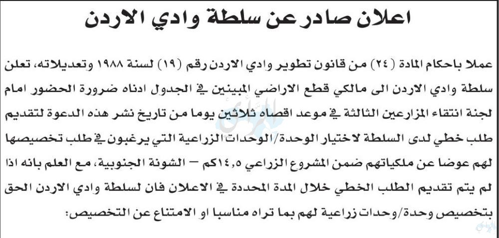 | إعلان لمالكي الأراضي في الشونة الجنوبية - أسماء |
