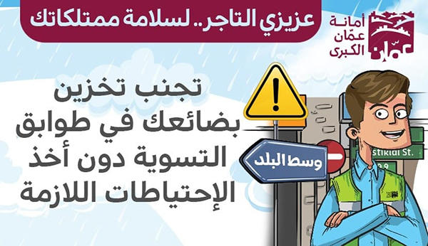 حذرت أمانة عمّان الكبرى، التجار من ارتفاع منسوب مياه الأمطار، داعية إلى اتخاذ إجراءات وقائية لحماية متاجرهم وبضائعهم.وقالت الأمانة في منشور لها على فيسبوك، إنه يجب تفقد... |