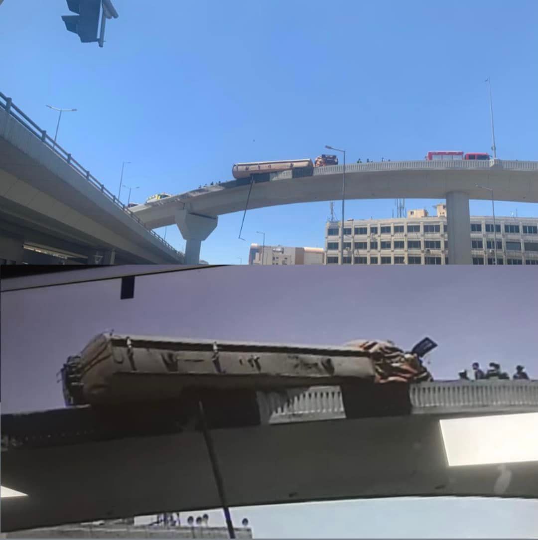 | إنزال صهريج النضح العالق فوق جسر المدينة بعد 6 ساعات من تدهوره |
