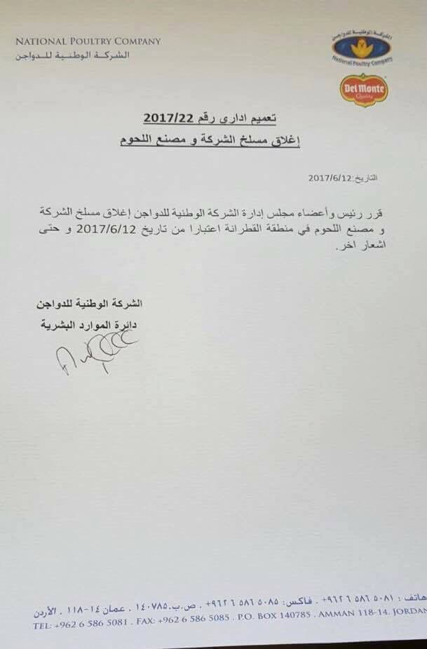 أماني رضوان قرر رئيس واعضاء مجلس ادارة الشركة الوطنية للدواجن اغلاق مسلخ الشركة ومصنع اللحوم في منطقة القطرانة اعتبارا من تاريخ 12-6-2017 حتى اشعار اخر وفق مصادر لـ احداث... |