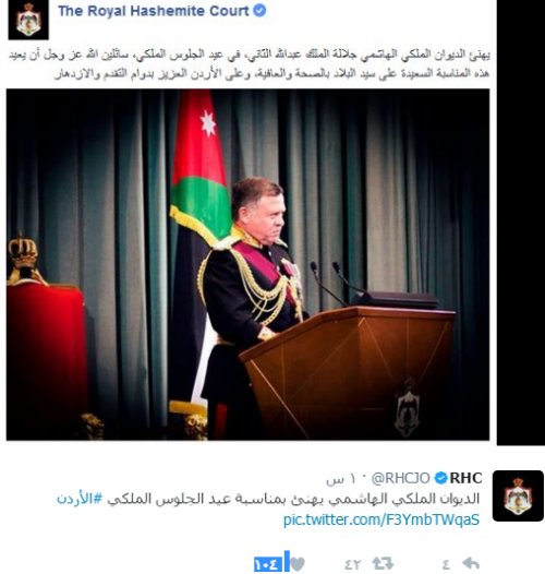 هنأ الديوان الملكي، جلالة الملك عبدالله الثاني بعيد الجلوس الملكي، وذلك في تغريدة على حسابه في موقع التواصل الاجتماعي 'تويتر'.وقال في تغريدته:'نهنئ جلالة... |