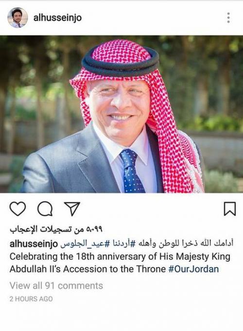 هنأ ولي العهد الامير الحسين بن عبدالله الثاني جلالة الملك عبدالله الثاني بعيد الجلوس الملكي عبر مواقع التواصل 'انستغرام'وكتب سموه 'أدامك الله ذخرا للوطن... |