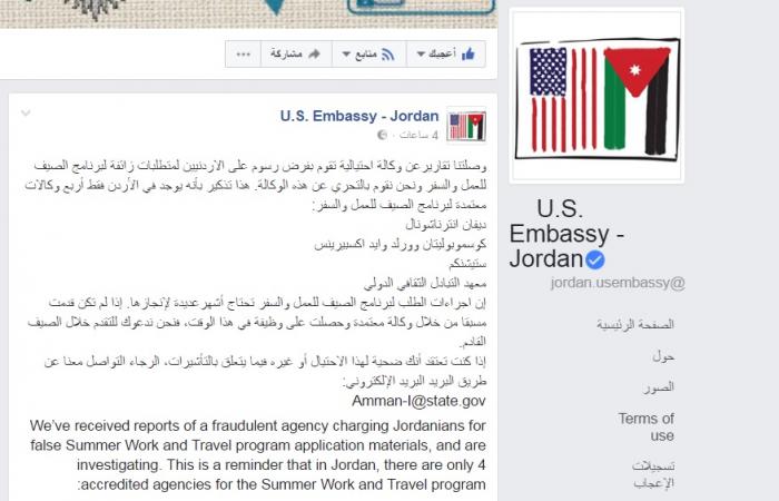 حذرت السفارة الأمريكية في عمان من وكالة سفر تحتال على الأردنيين فيما يتعلق ببرامج السفر والعمل خلال فصل الصيف في الولايات المتحدة.وقالت السفارة في بيان لها نشرتنه على... |