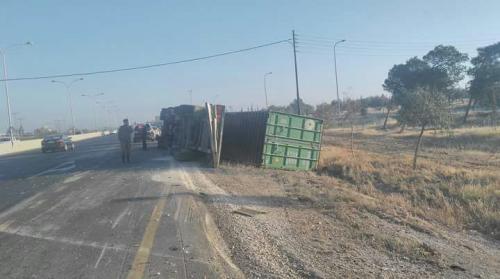 | اصابة أثر انقلاب شاحنة على طريق المطار |