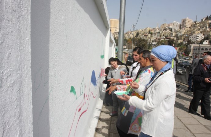 نفذت منظمة السلام والصداقة الدولية بالتعاون مع أمانة عمان رسم جدارية بطول 25 متر على السور الخارجي لسوق الجمعة الشعبي في رأس العين تحت شعار لوحة المحبة والسلام العالمية... |
