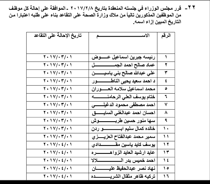 قرر مجلس الوزراء إحالة موظفين في عدد من الوزارات والدوائر إلى التقاعد.كما قرر المجلس عدم التجديد لموظفين والتمديد لآخرين، وتالياً الأسماء: |