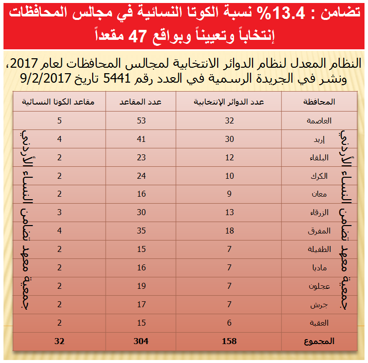 | تضامن : 13.4% نسبة الكوتا النسائية في مجالس المحافظات إنتخاباً وتعييناً وبواقع 47 مقعداً |