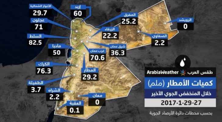تأثرت المملكة خلال الأيام الماضية بمُنخفض جوي،عمل على تساقُط كميات جيّدة من الأمطار في أجزاء واسعة من البلاد،إضافة إلى تساقُط الثلوج فوق بعض المرتفعات الجبلية.كميات الأمطار... |