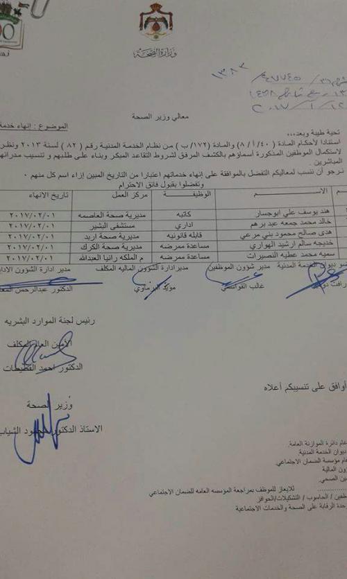 - قرر وزير الصحة الدكتور محمود الشياب وبناء على تنسيب لجنة الموارد البشرية انهاء خدمات 25 موظف لاتمامهم شروط التقاعد المبكر وبناء على طلبهم وعلى النحو التالي... |