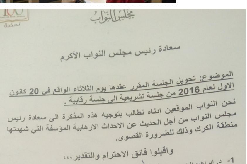 - وقع 50 نائبا على مذكرة نيابية تبناها النائب ابراهيم البدور بتحويل جلسة الثلاثاء من تشريعية الى رقابية.وجاءت هذه المذكرة على خلفية احداث الكرك التي راح ضحيتها ٩ شهداء... |