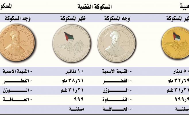 أصدر البنك المركزي الأردني مجموعة من المسكوكات الذهبية والفضية والبرونزية، بمناسبة مرور مئة عام على قيام الثورة العربية الكبرى، والتي اعلنها الشريف الحسين بن علي ثورة... |